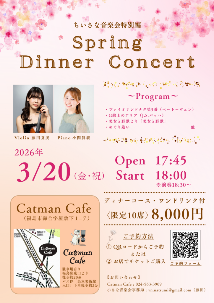 3月20日(金祝)、福島市にある「Catman Cafe」にて、ディナーコース・ワンドリンク付の特別なコンサートを開催します。