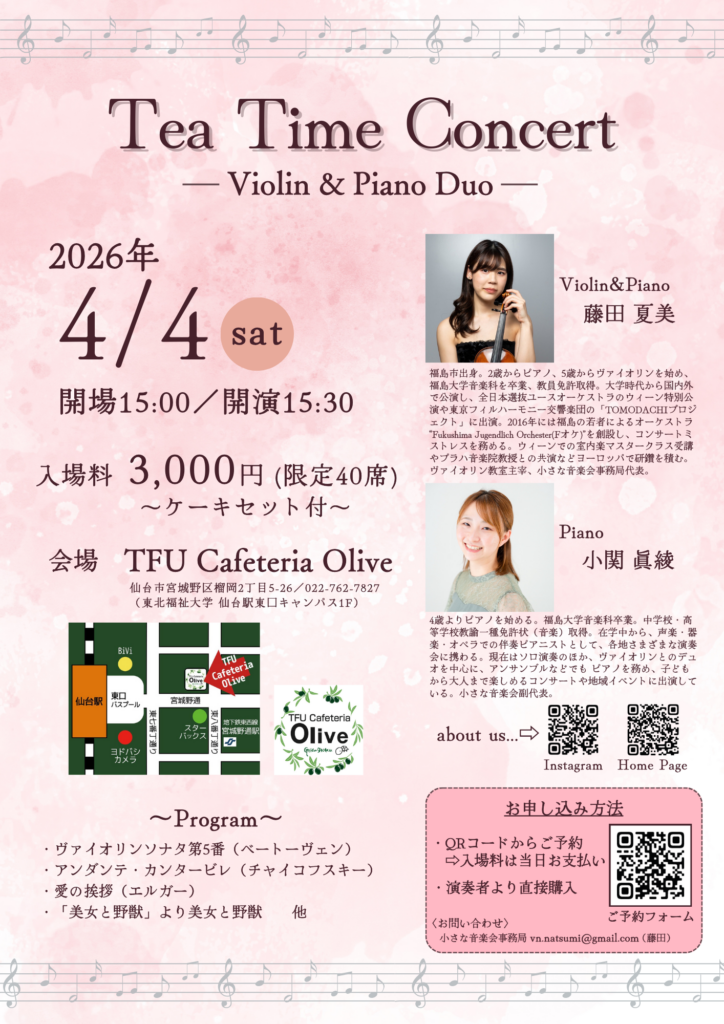 『TFU Cafeteria Olive』さんにて《ケーキセット付》のコンサートとなります。